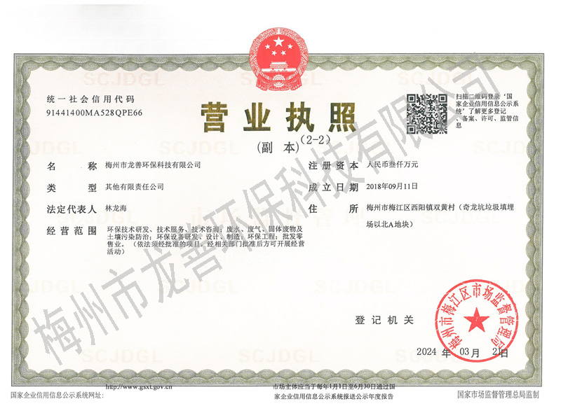 梅州市龍善環保科技有限公司為龍善環保股份有限公司(簡稱“龍善環?!保┳庸?。龍善環保于1995年12月成立,注冊資本為人民幣6,000萬元,總部位于深圳市南山區月亮灣大道2078號兆龍大樓16層。公司經生態環境部、廣東省生態環境廳、深圳市生態環境局、深圳市交通運輸委員會、深圳海事局等部門許可專業從事陸地和海洋環境保護產業的高科技民營企業,主要經營業務包括工業廢物收運、資源化利用和無害化處理處置、海洋船舶污油水接收和集中處理處置、突發環境事故清污應急處置等......